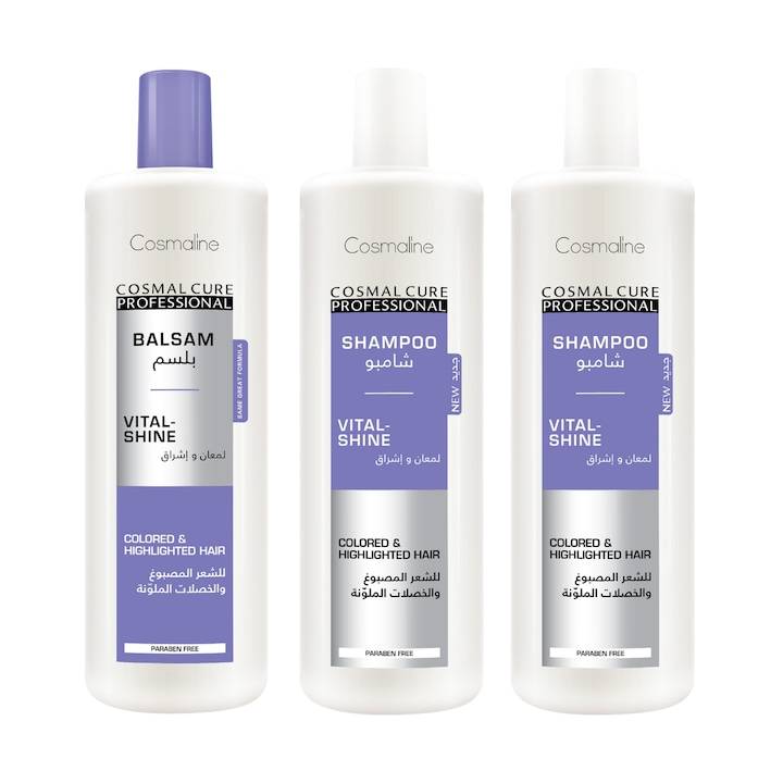 Pachetul Cosmaline Professional Vital Shine, format dintr-un balsam de 500ml si doua sampoane de 500ml, este o alegere ideala pentru ingrijirea parului vopsit. Aceasta gama premium ofera o combinatie perfecta de ingrediente de inalta calitate, inclusiv keratina si nuca de cosos, pentru a asigura parului tau o ingrijire profunda si revitalizanta.
