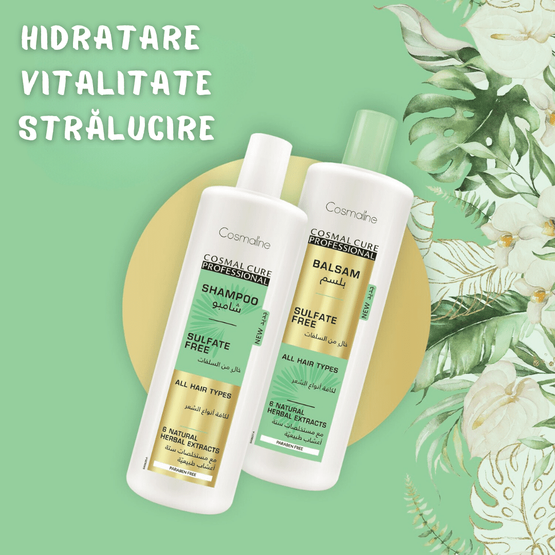 Cosmaline Professional Sulfate Free redefineste standardul ingrijirii parului cu Pachetul Balsam 500ml si Sampon 500ml, o experienta de spalare fara sulfati, dedicata tuturor tipurilor de par. Cu o formula avansata, imbogatita cu tehnologia de reparare si infuzata cu proprietatile nutritive a 6 extracte naturale din plante, aceste produse reprezinta o solutie pentru vitalitatea, culoarea si hidratarea parului tau.